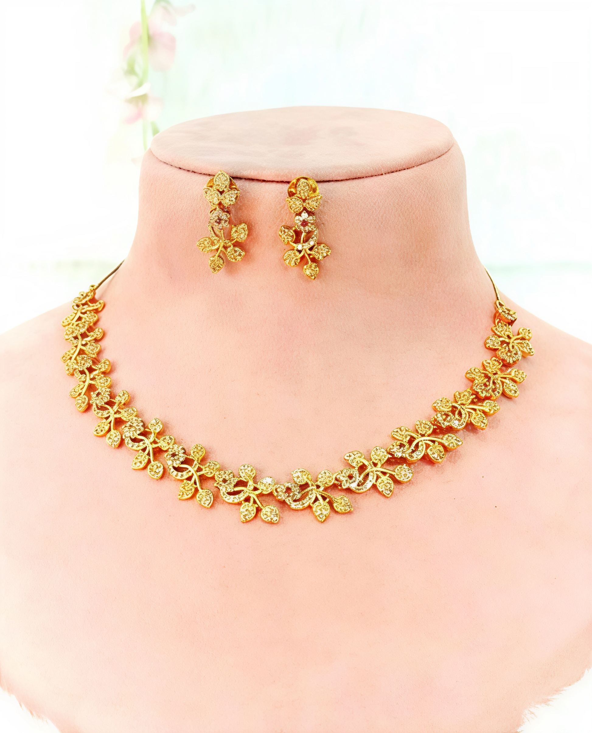 An artistic AD and Kundan leaf motifs necklace, giving it a graceful and stylish look. The design sparkles with fine AD and shines with detailed craftsmanship that adds charm to any outfit. It comes with a pair of stunning matching AD earrings, perfectly designed to complete the elegant look — ideal for parties, weddings, or festive occasions.